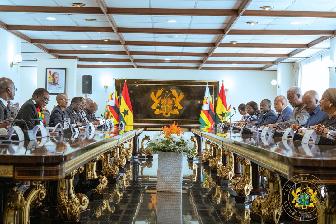 President John Dramani Mahama has opened bilateral talks with Zimbabwe’s President Emmerson Mnangagwa at Peduase Lodge, putting mining cooperation, agricultural knowledge sharing, renewable energy and a potential direct air link between Accra and Harare at the centre of what he called a relationship that went far beyond diplomacy.